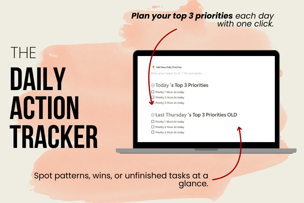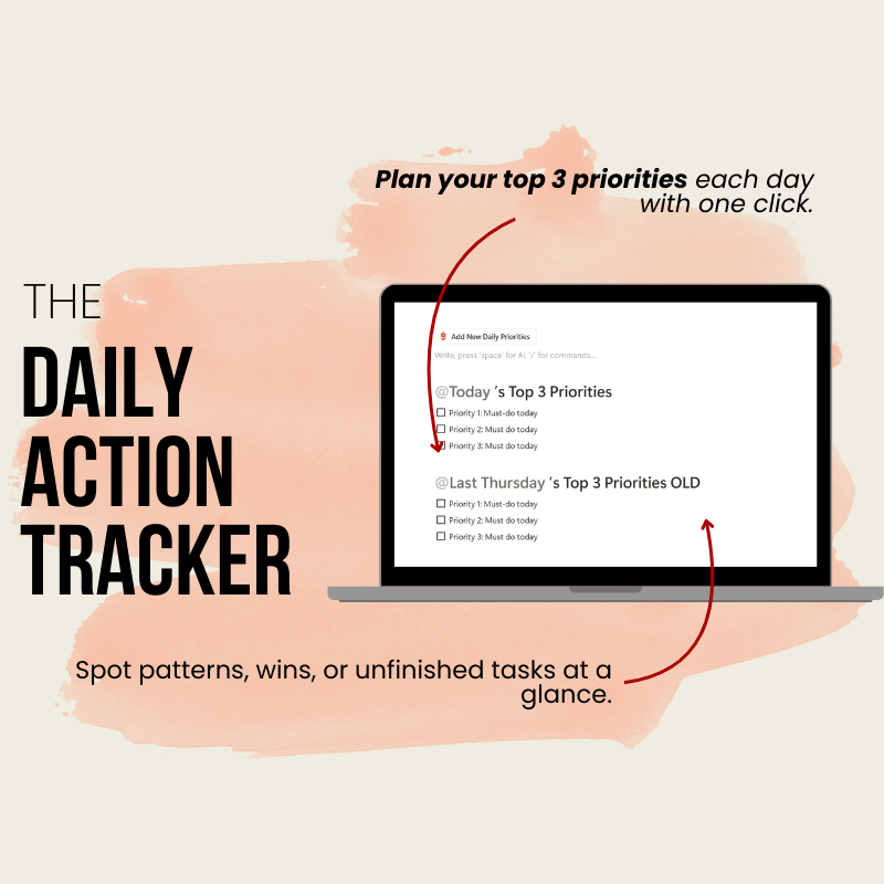The Daily Action Planner is designed for solopreneurs who want clarity and focus without the tech headache. Just click one button to plan your top 3 priorities for the day. Check them off as you go. Add more if you need.