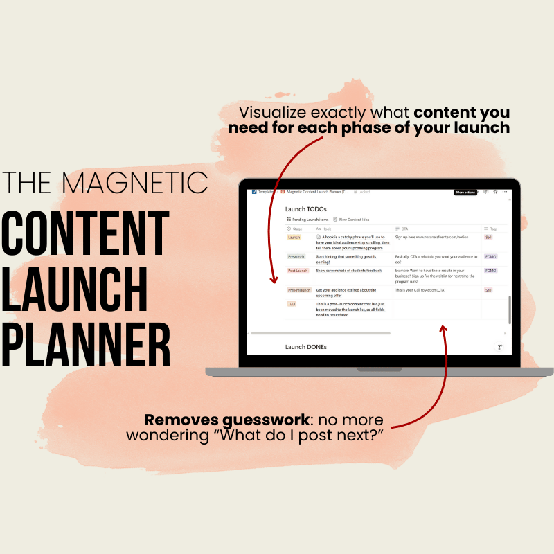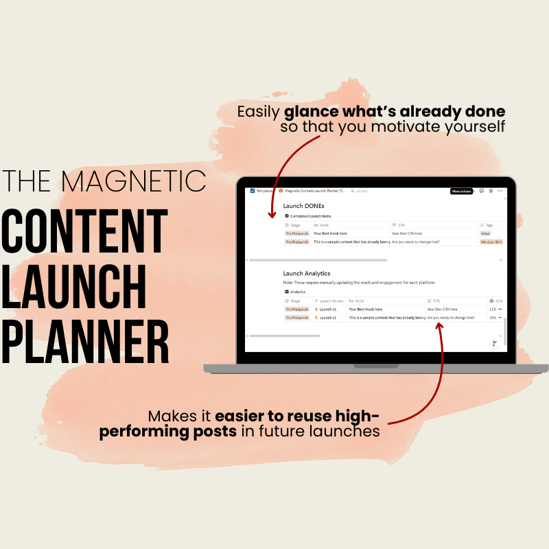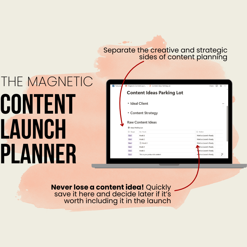 The Magnetic Content Launch Planner helps you turn raw ideas into a strategic content plan that builds momentum and sells your offer.